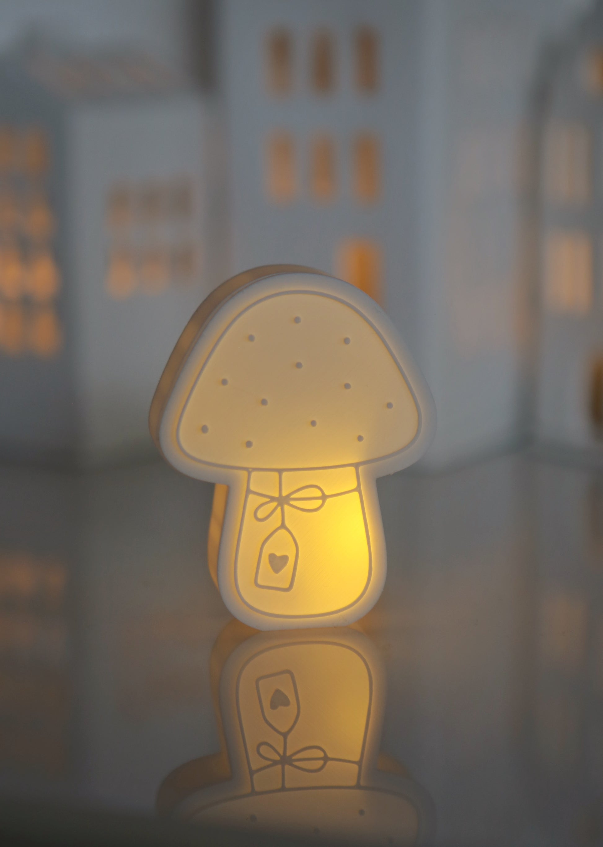 Im Tütchen steckt das Minilicht (aus recyceltem PLA gedruckt) plus passender Karte und ein warmweißes Ballonlicht, das bis zu 8 Stunden leuchtet und einen gemütliches Licht zaubert.