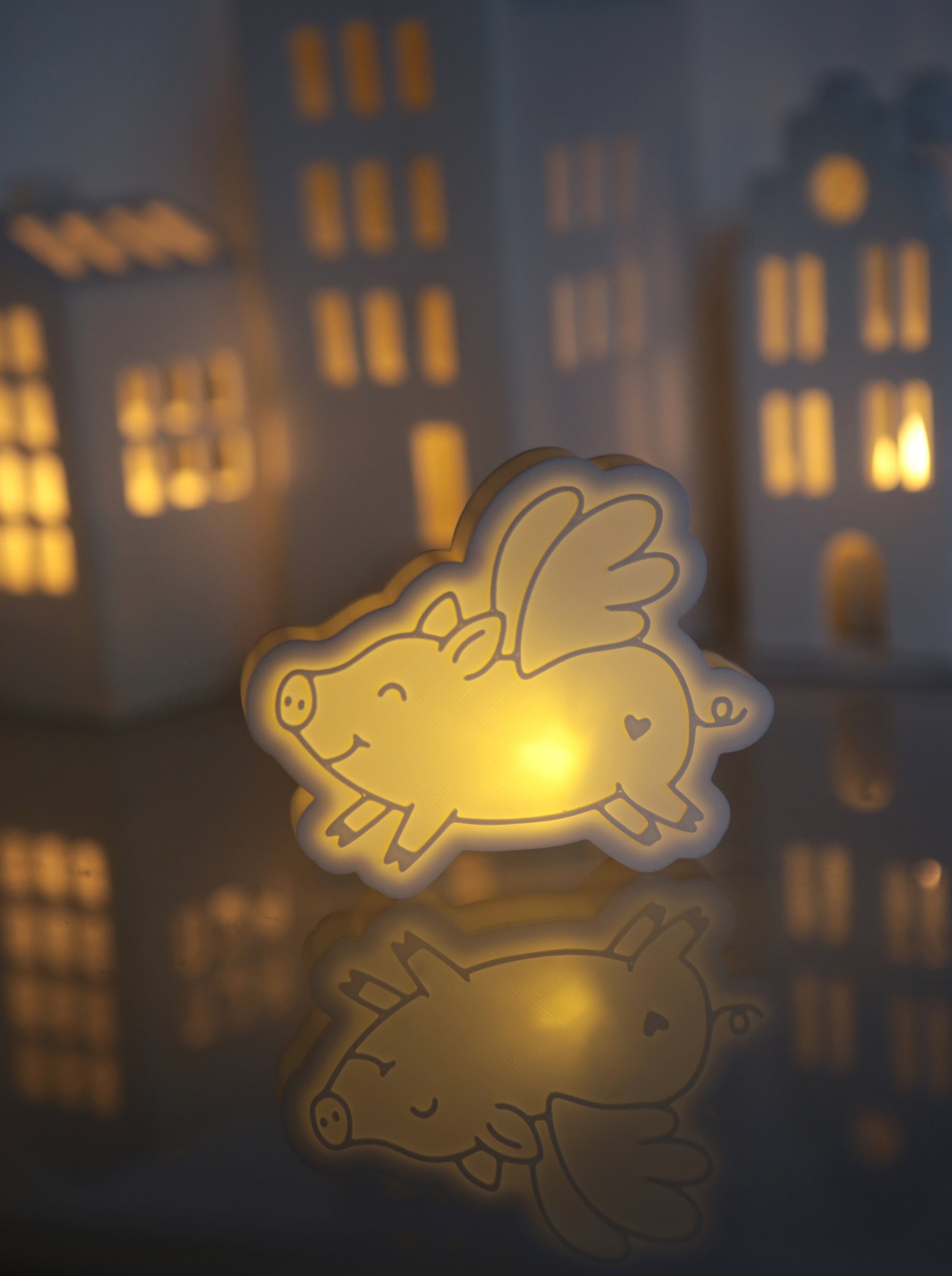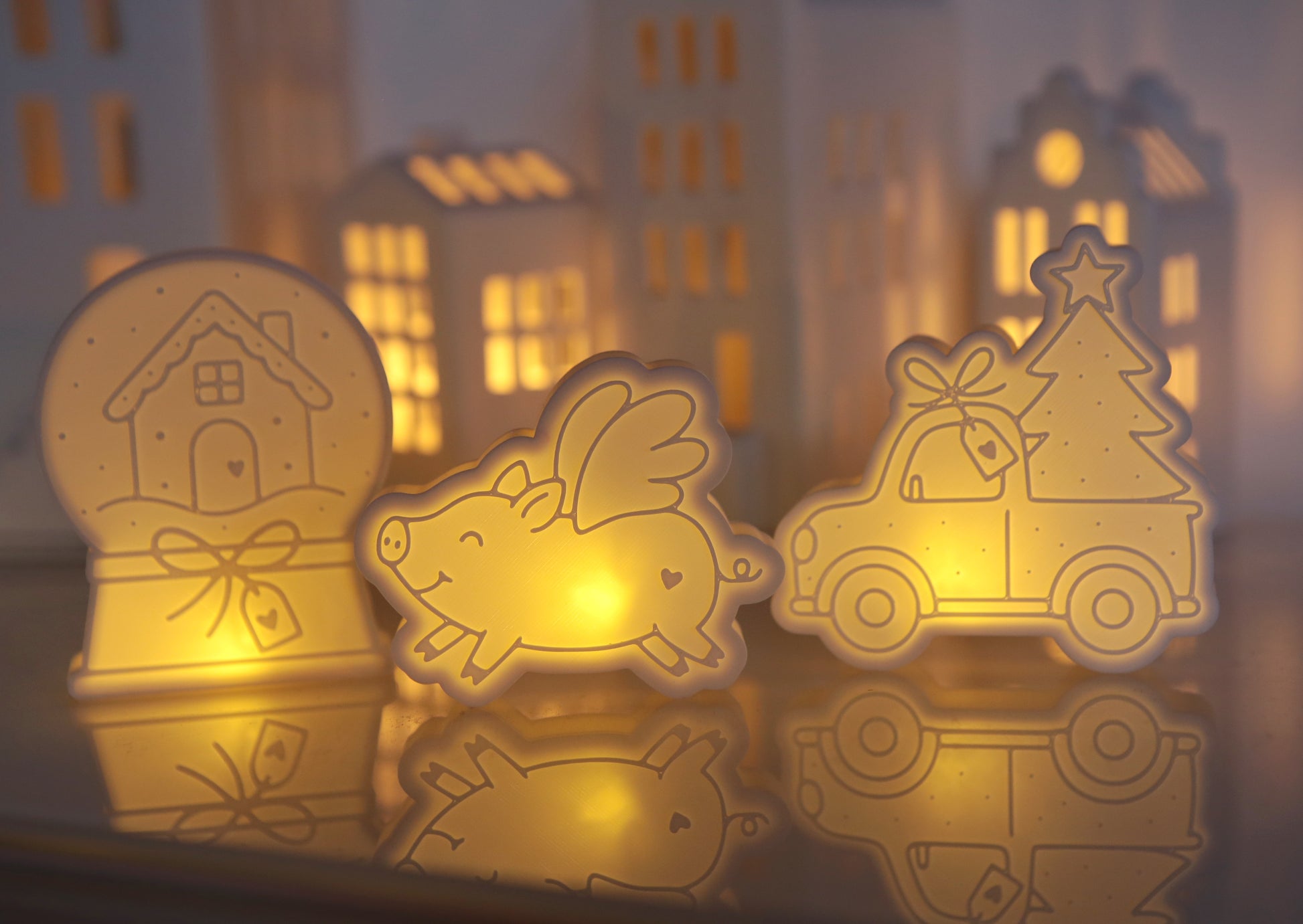 Die kleinen Minilichter sind wirklich ein ganz besonderes Geschenk. Als Motiv gibt es das Schwein, die Schneekugel, den Glückspilz, das Pferd und den Weihnachtstruck.